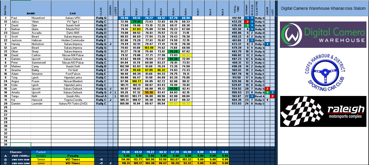 Classes Tanya Nehl – Road Tyres A David Opie – Rally Tyres B Jukka Ylinen – Rally Tyres C Nathan Quinn – Rally Tyres D Jackson Halloran – Rally Tyres E Paul Mountford – Rally Tyres G