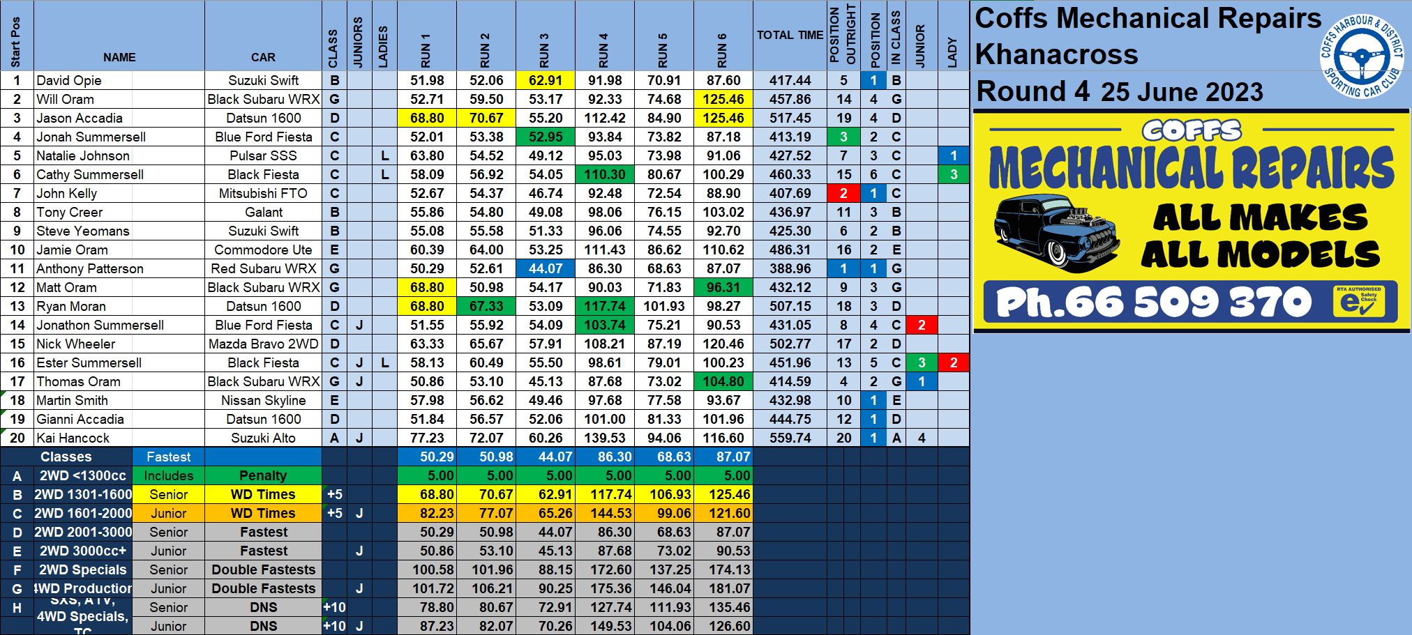 Note: Contrary to the spreadsheet, Class D was won by Nick Wheeler due to change of car by the other competitors.